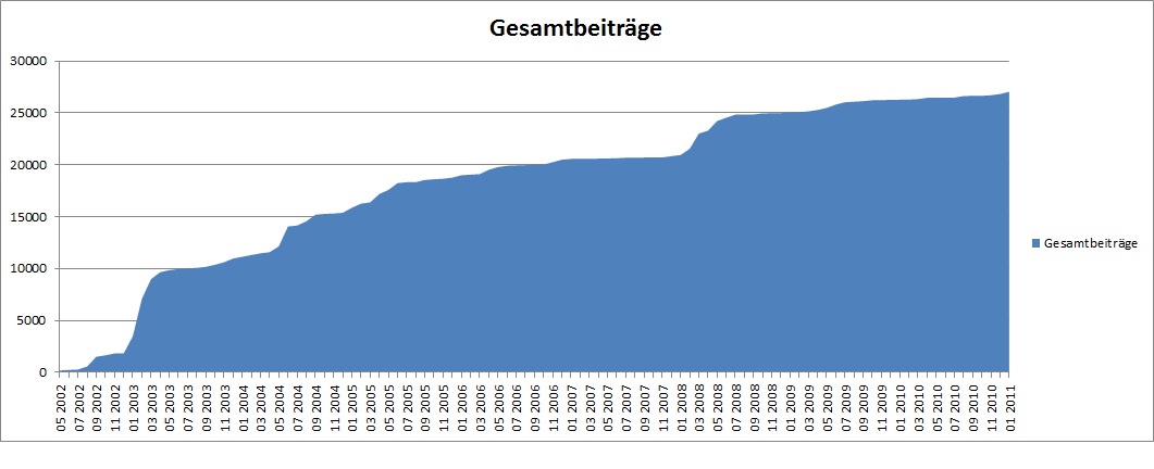 Anbei noch zwei Diagramme zu den Beitragszahlen. Hatte eigentlich ein Script vor, dass die Daten per OpenFlashCharts visualisiert, aber das haut noch nicht ganz hin. Da musste eben kurzerhand Excel herhalten.