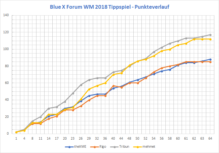 Auch das Finale im Tippspiel hat sich als spannender Höhepunkt herausgestellt. Nach insgesamt 64 Spielen darf ich den glücklichen Gewinner des WM 2018 Tippspiels verkünden: herzlichen Glückwunsch, Tribun!