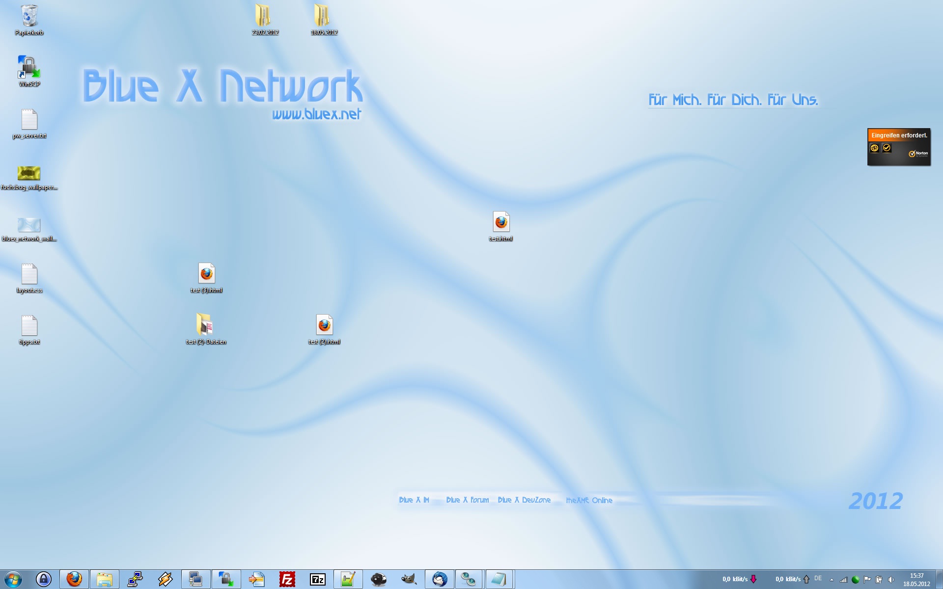 Heute wirklich mal spontan und unaufgeräumt. Der Wallpaper ist heute morgen in einer kurzen 5-Minuten-Session aus den Schnipseln eines Entwurfs der Blue X Network Seite entstanden