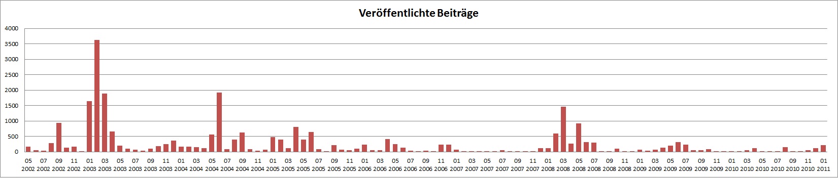 Anbei noch zwei Diagramme zu den Beitragszahlen. Hatte eigentlich ein Script vor, dass die Daten per OpenFlashCharts visualisiert, aber das haut noch nicht ganz hin. Da musste eben kurzerhand Excel herhalten.